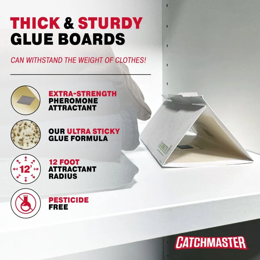 Protect your wardrobe and textile storage areas with Catchmaster Clothes Moth Traps. Designed specifically for closets, dressers, and attics, these sticky traps help control Webbing Clothes Moths and Case Making Clothes Moths, two of the most common threats to clothing and fabrics. Each trap uses a pheromone-based lure to attract male moths, interrupting the breeding cycle and helping preserve natural fibers, family heirlooms, and everyday clothing.